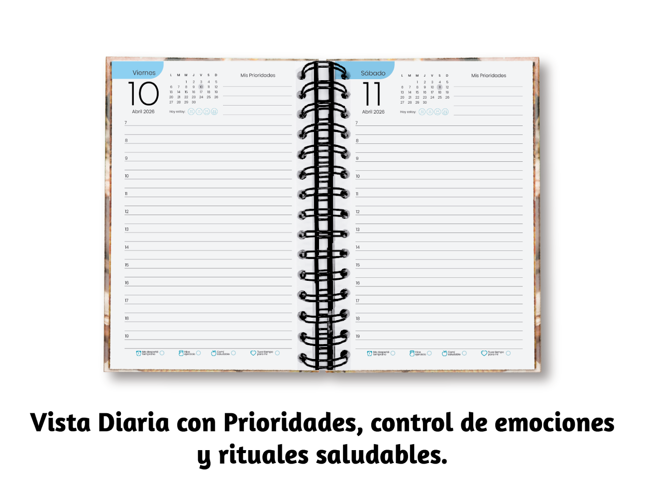 - Vista diaria con monitoreo de emociones y prioridades del día.